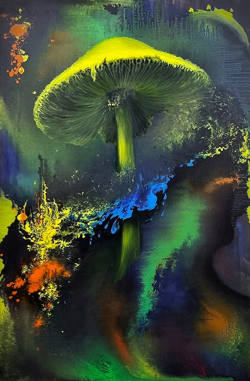전기숙 작가의 회화. 버섯이라는 짧은 생애의 정의는 캔버스 위에서 우주적 스케일로 확장한다. 미시적 존재가 거대한 생명의 흐름으로 치환되는 전환의 장면이다.