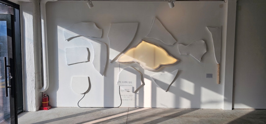 김상균 작가의 설치. 흩어진 조각들이 벽면에 놓이면서 내부의 빛은 발광하듯 새어 나온다. 파편은 단절이 아니라 또 다른 연결을 모색하는 유기체로 기능한다.