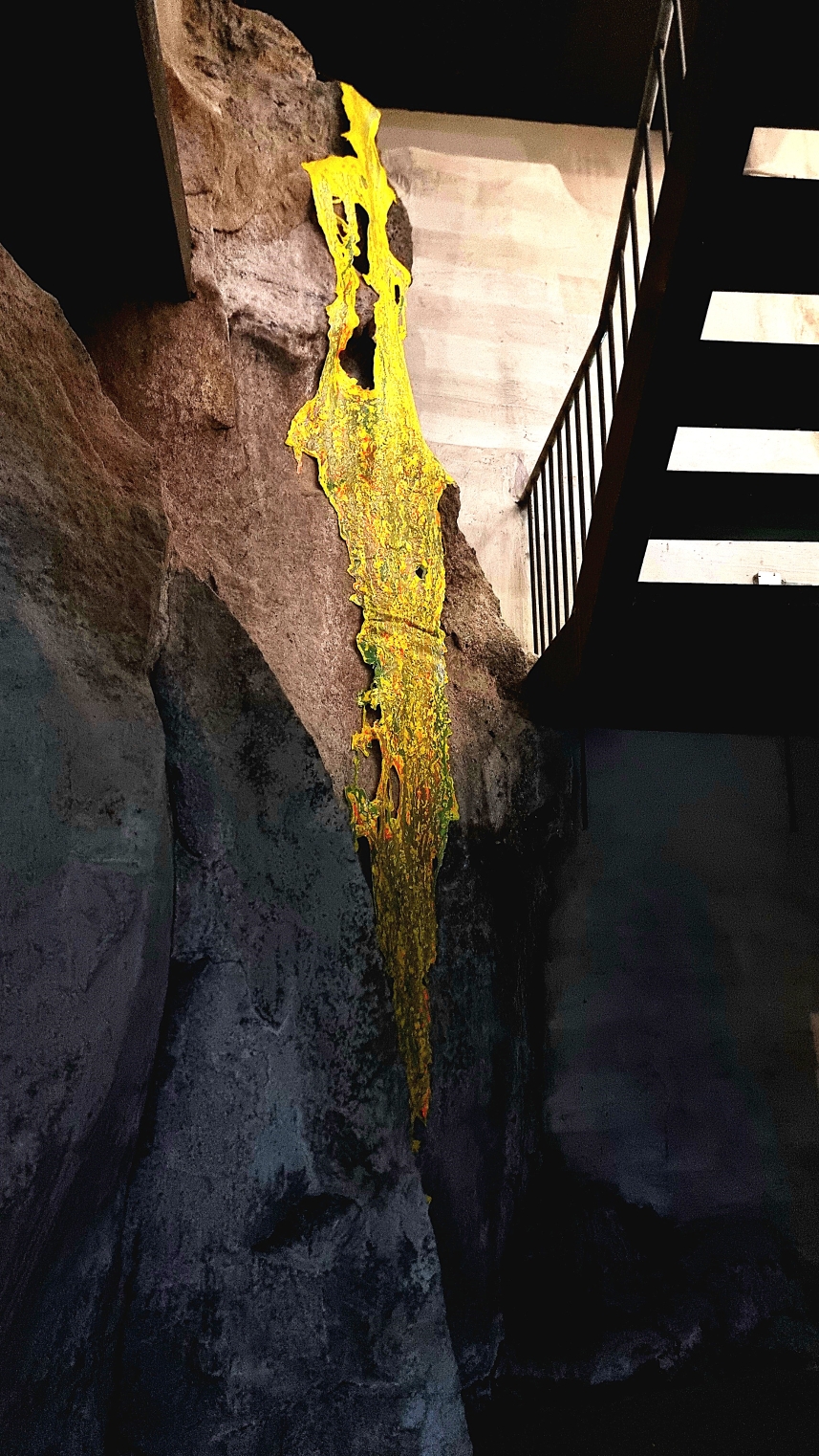 전기숙 작가의 현장 설치. 화산의 흔적 같은 바위벽 위로 노란 물질이 흐른다. 공간 자체가 생명의 흔적을 새로 기록하는 캔버스로 변한다. 장소가 곧 작품이 된다.
