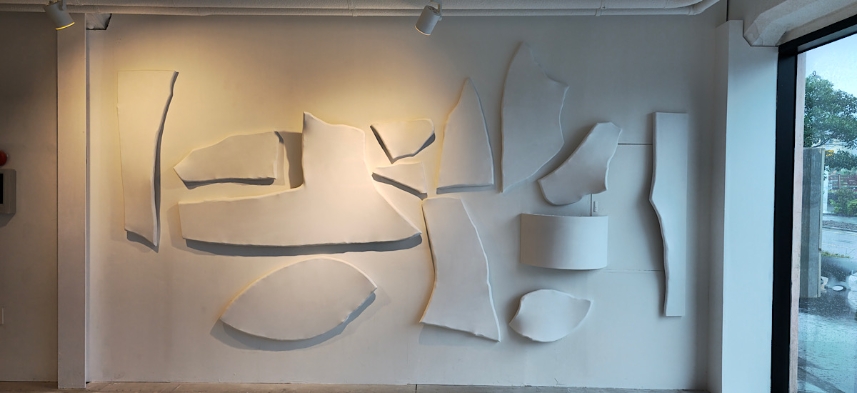 김상균 작가의 설치. 부서진 파편이 벽면을 따라 배치되고 빛을 머금는다. 단절과 연결, 파괴와 생성이 교차하는 장면이 덤지는 건 ‘회화의 확장’이라는 질문이다.