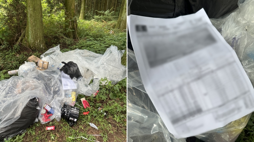 드라마 촬영팀이 무단 투기한 쓰레기(왼쪽)와 드라마 촬영 계획서로 보이는 종이 (시청자 제공)