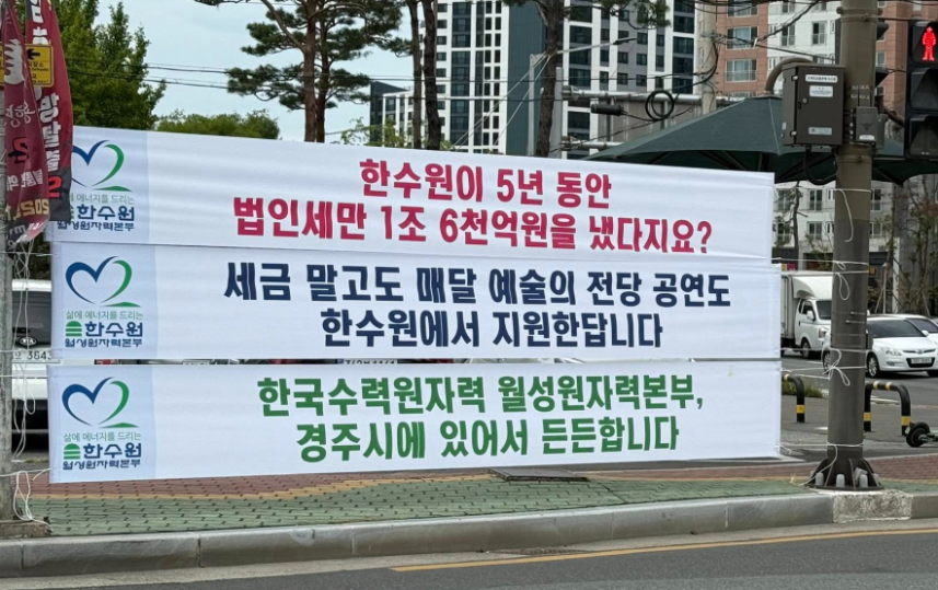 앞서 한국수력원자력 월성원자력본부는 최근 경북 경주시 곳곳에 "5년 동안 월성원자력본부가 경주시 지방세로 2,190억을 냈다지요?', '이번 벚꽃마라톤 때 월성본부가 무료로 주는 국수도 맛있게 먹었잖아!'라는 내용이 담긴 현수막을 내걸었습니다.