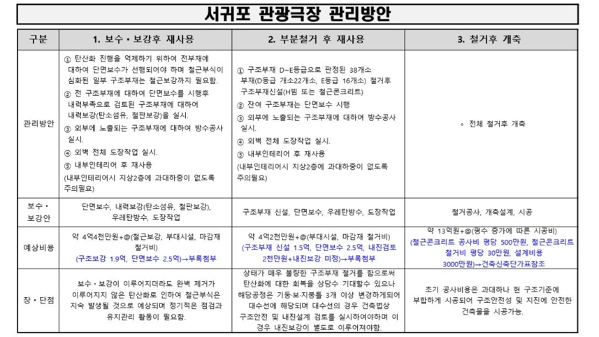 서귀포 관광극장 관리 방안 정밀안전진단 용역 보고서에 따르면 용역진은 첫 번째 관리 방안으로 '보수·보강 후 재사용'을 제시했습니다.