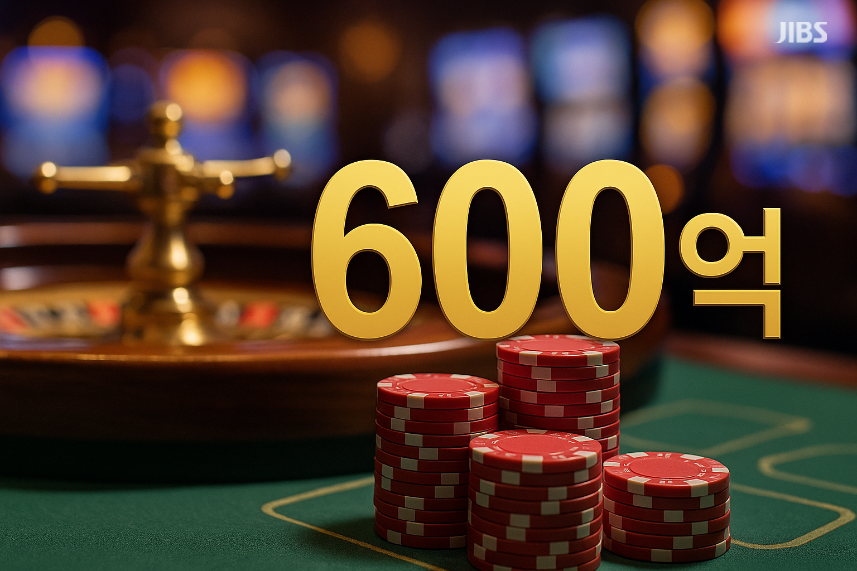 제주 드림타워 전경과 ‘600억 돌파’를 상징한 카지노 칩 이미지.