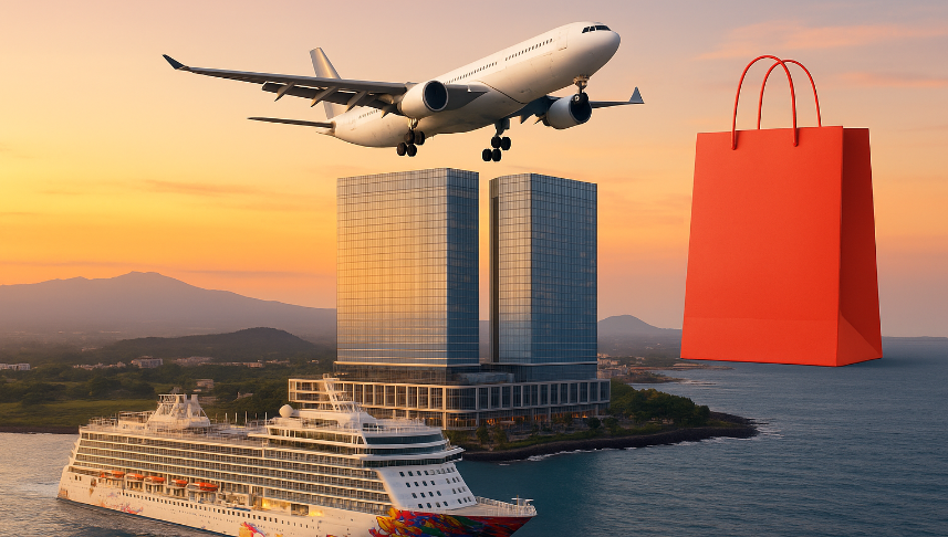 제주 드림타워와 항공기·크루즈·면세 쇼핑 장면이 하나의 흐름으로 이어지며, 중국 단체 무비자 시대의 관광 연결 고리를 상징적으로 담아낸 이미지.