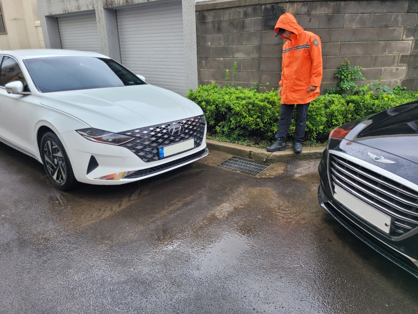 제주시 연동 골목에서 소방대원이 역류한 배수구를 점검하고 있다. (제주도소방안전본부 제공)