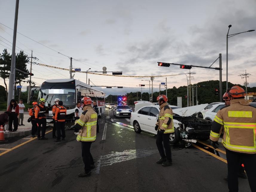오늘(7일) 제주소방안전본부에 따르면, 이날 오후 6시 2분쯤 제주 서귀포시 성산읍 신양교차로에서 20명이 탄 전세버스와 승용차가 부딪히는 사고가 났습니다.