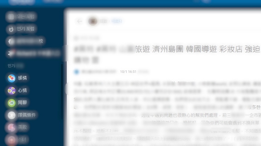 대만 온라인 커뮤니티 ‘디카드(Dcard)’에 올라온 제주 단체여행 후기 글. 제목에 ‘제주도 단체여행 중 한국 가이드가 화장품점에서 강매했다’는 내용이 눈에 띈다. (온라인 커뮤니티 캡처)