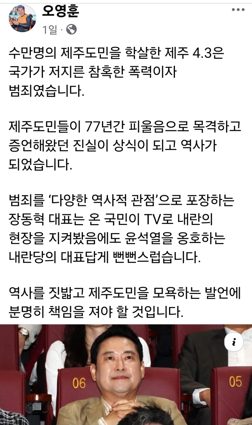 오영훈 제주특별자치도지사는 지난 7일 자신의 페이스북에 최근 장 대표가 '건국전쟁2'를 관람했다는 언론 보도와 함께 비판 글을 게시했습니다.