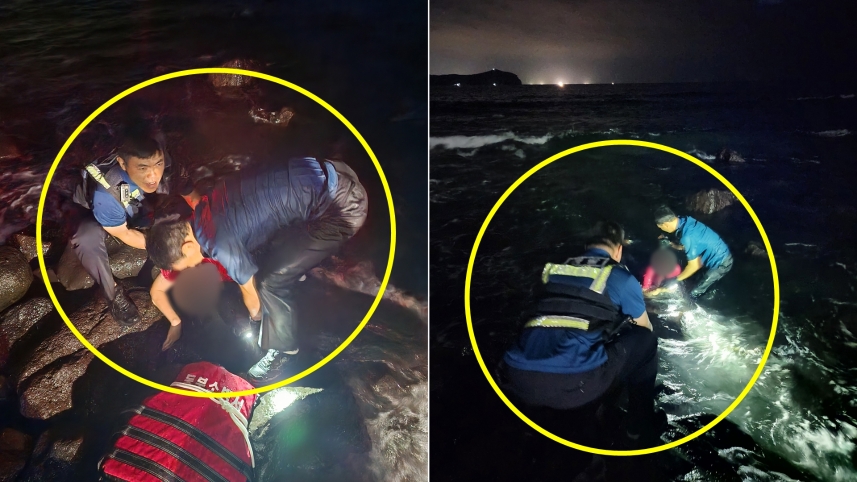 지난 4일 새벽 5시 20분쯤 서귀포시 성산일출봉 동쪽 해안가에서 40대 여성이 경찰에 의해 구조되는 모습 (서귀포경찰서 제공)