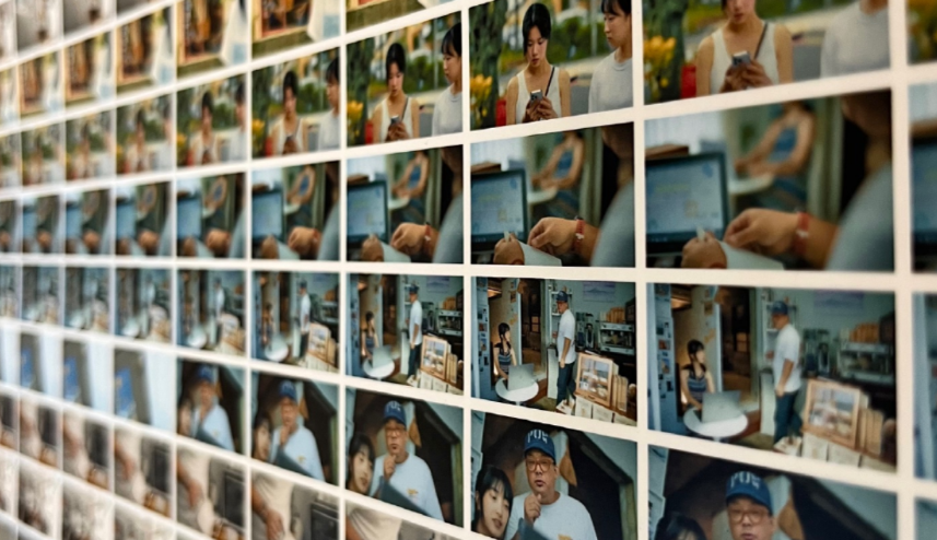 ‘몽타쥬, 영화의 재조립’ 설치 장면. 단영화 ‘이별의 해부학’의 모든 프레임을 인화해 배치한 벽면은, 영화가 해체된 뒤에도 남는 감정의 잔상을 시각화한다. (아트스페이스 빈공간 제공)