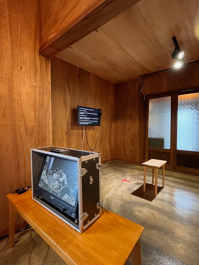 ‘몽타쥬, 영화의 재조립’ 전시 전경. 전시장 한편 모니터에는 영화 장면이 반복 재생된다. 꺼진 스크린 뒤, 감정은 다시 몸을 얻는다. (아트스페이스 빈공간 제공)