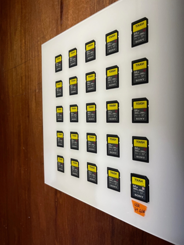 ‘몽타쥬, 영화의 재조립’ 전시 설치 장면. 단편영화 ‘이별의 해부학’ 촬영에 사용된 메모리카드들이 전시장 안에 배열돼 있다. 영화의 시간과 감정이 데이터 형태로 남아 있다. (아트스페이스 빈공간 제공)