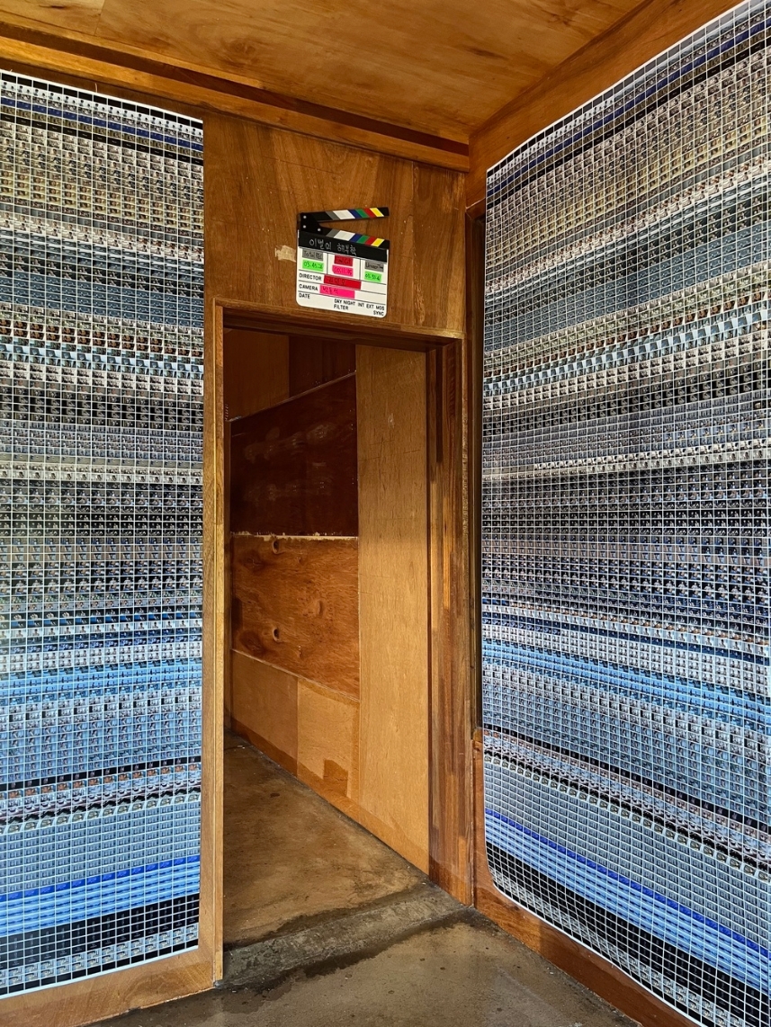 ‘몽타쥬, 영화의 재조립’ 설치 장면. 영화 모든 프레임이 공간의 벽을 따라 배열돼 있다. 스크린에서 흘러나온 시간과 감정이 목재 구조물 안에서 새 호흡을 얻는다. (아트스페이스 빈공간 제공)