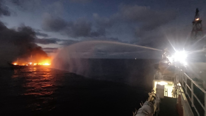 어제(12일) 새벽 서귀포시 마라도 남동쪽 약 35㎞ 해상에서 화재가 발생한 어선 (사진, 서귀포해양경찰서)