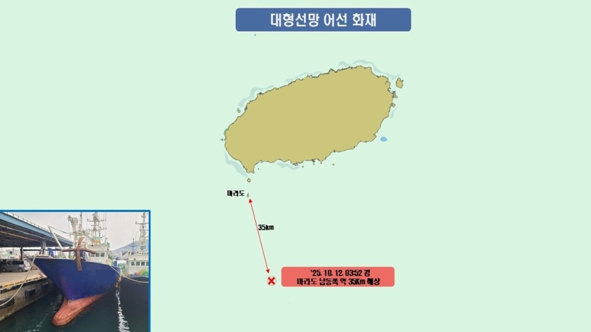 앞서 어제(12일) 새벽 3시 52분쯤 서귀포시 마라도 남동쪽 약 35㎞ 해상에 있던 A 호에서 화재가 발생했다는 신고가 접수됐습니다.
