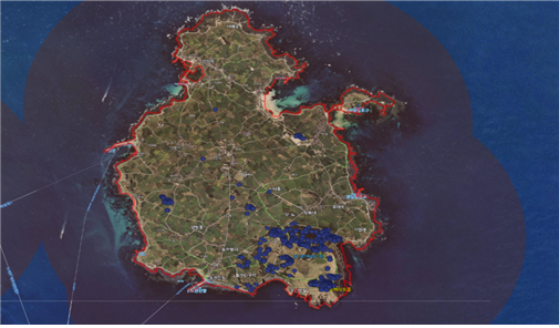 우도면 우도봉 일대 소나무 재선충병 현황(파란색 고사목 표시)