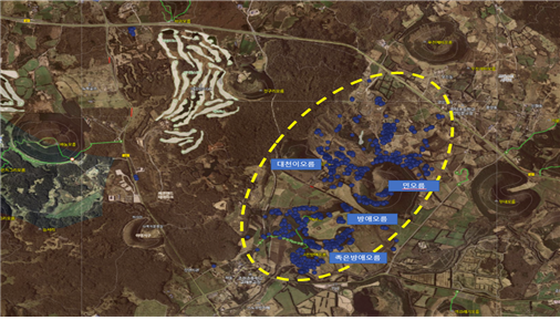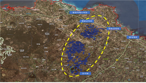 제주시 구좌읍 행원리, 한동리 일대 소나무 재선충병 현황(파란색 고사목 표시)