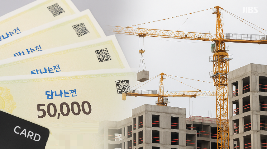 정책이 살린 소비와 멈춘 건설의 현실을 상징적으로 보여주는 이미지. 탐나는전과 카드 결제의 온기 뒤로, 식어버린 공사현장이 대조된다. (편집 이미지)
