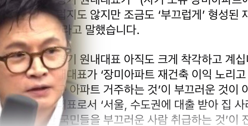 이날 한동훈 전 대표는 즉각 페이스북을 통해 “장미아파트 재건축 이익을 노리고 전세를 준 게 부끄러운 게 아니다”며, “여당 원내대표로서 대출 받아 집 사려는 국민을 부끄러운 사람 취급하는 게 진짜 부끄러운 일”이라고 반박했습니다.