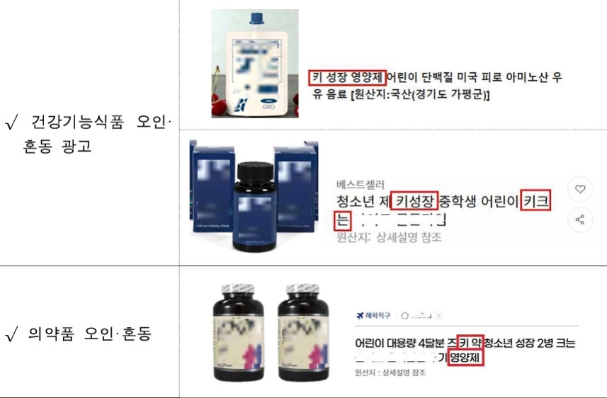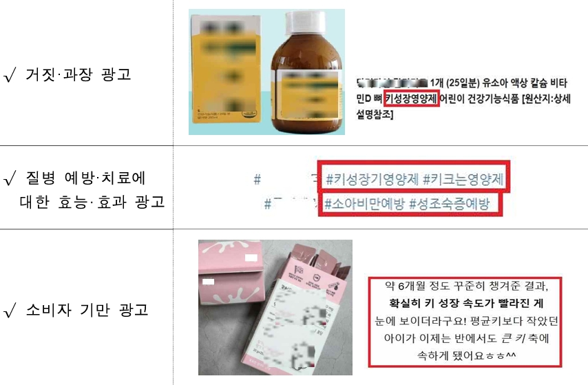 주요 위반 사례는 ▲'키 성장 영양제', '중학생 어린이 키 크는' 등 일반식품을 건강기능식품으로 오인하게 한 광고(122건) ▲'키 성장' 등 검증되지 않은 기능성을 내세운 거짓 광고(16건) ▲식품을 의약품처럼 표현한 광고(8건) ▲'성조숙증 예방' 등 질병 예방·치료 효과를 표방한 광고(6건) ▲가짜 체험기 사용(1건) 등이었습니다.