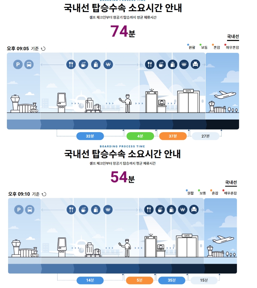 한국공항공사 실시간 데이터(25일 오후 9시 5분 기준)에 따르면, 제주공항 국내선 탑승수속 평균 소요시간은 74분으로 ‘매우 혼잡’ 수준이었다. 비슷한 시각 김포공항은 54분으로, 상대적으로 원활했다.