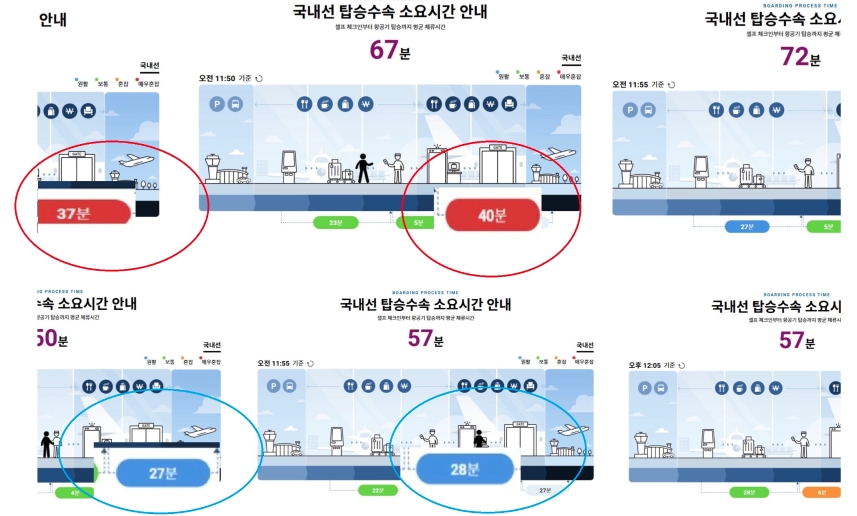 국내선 소요시간 내 붉게 물든 구간은 입구가 아니라 보안검색대를 지나 수하물 재검과 출국 대기로 이어지는 내부 동선입니다.