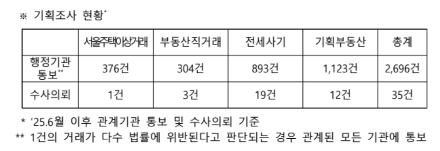 우선 국토부는 이재명 정부 출범 이후인 올해 6월부터 부동산 이상거래 전수조사에 착수해 현재까지 주택 이상거래나 전세사기, 기획부동산 등 불법행위 전반을 조사한 결과 의심거래 2,696건을 적발했습니다.