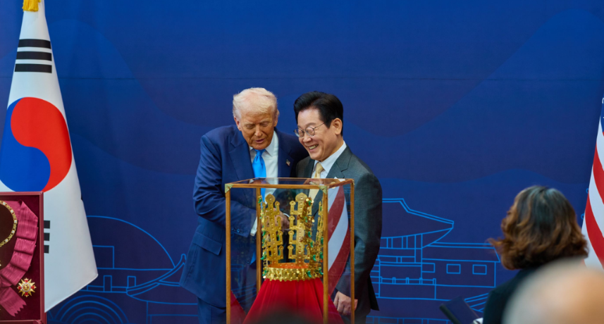 이재명 대통령이 29일 국립경주박물관에서 도널드 트럼프 미국 대통령에게 '천마총 금관 모형'을 선물한 이후 대화를 나누고 있다. (대통령실) 있다 [출처:중앙일보] https://www.joongang.co.kr/article/25377801