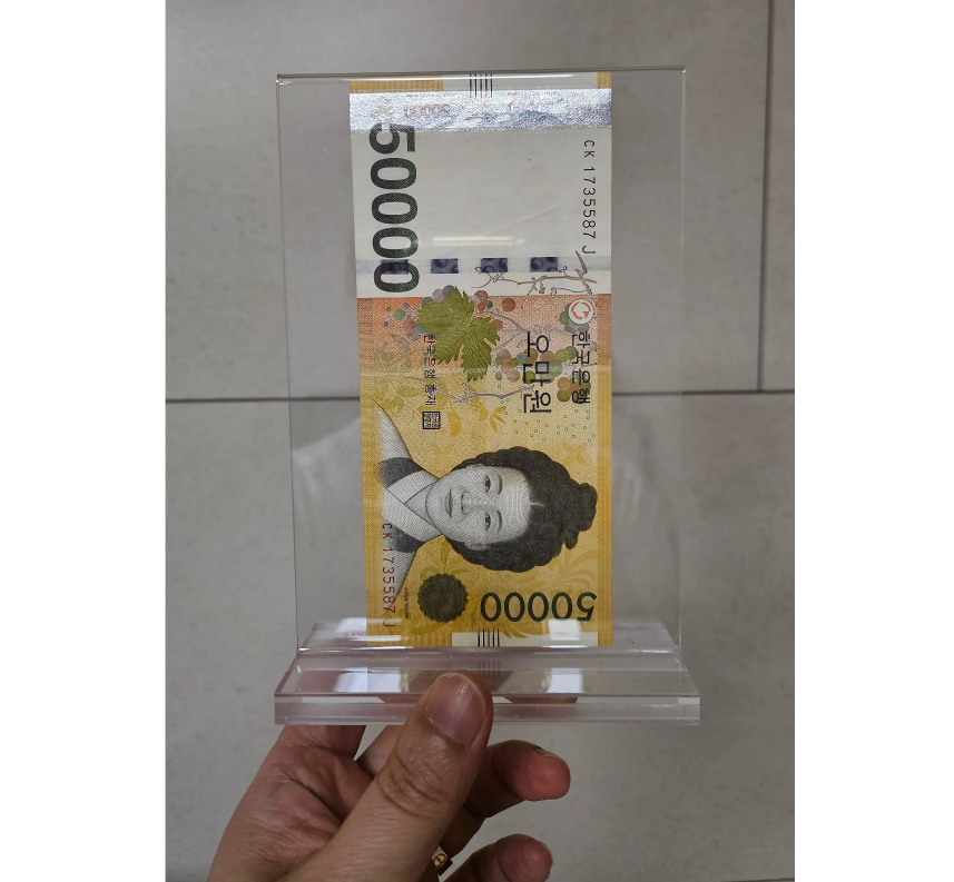 A씨는 다음날에도 SNS에 추가 사진을 공개했습니다. 그가 올린 사진 중에는 실제로 이 회장으로부터 받은 5만 원권을 아크릴 액자에 담은 사진도 포함돼 눈길을 끌었습니다. A씨는 "동생들이 제가 너무 고개 숙여 인사하는 사진이 없어 보인다고 해서 안 올렸던 사진을 함께 올린다"며 "귀여운 이재용 회장님 사진도 같이 공유한다"고 적었습니다.