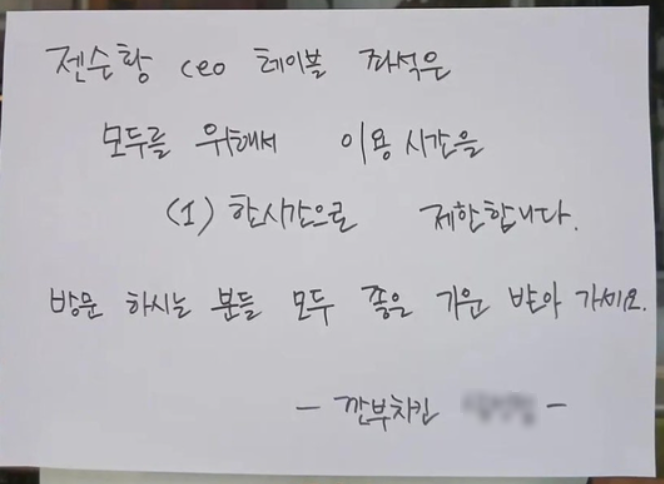 안내문에는 "젠슨 황 CEO 테이블 좌석은 모두를 위해 이용 시간을 1시간으로 제한합니다"라며 "방문하는 분들 모두 좋은 기운 받아 가세요"라고 적혔습니다.
