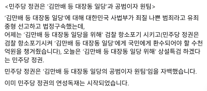 “민주당 정권은 김만배 등 대장동 일당의 공범이자 원팀이다.”