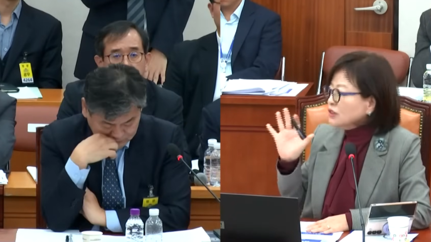 지난달 28일 국정감사에서 진선미 더불어민주당 의원(오른쪽)이 유담 교수의 채용과 관련해 이인재 인천대 총장에게 문제 제기를 하고 있다. (유튜브 캡처)