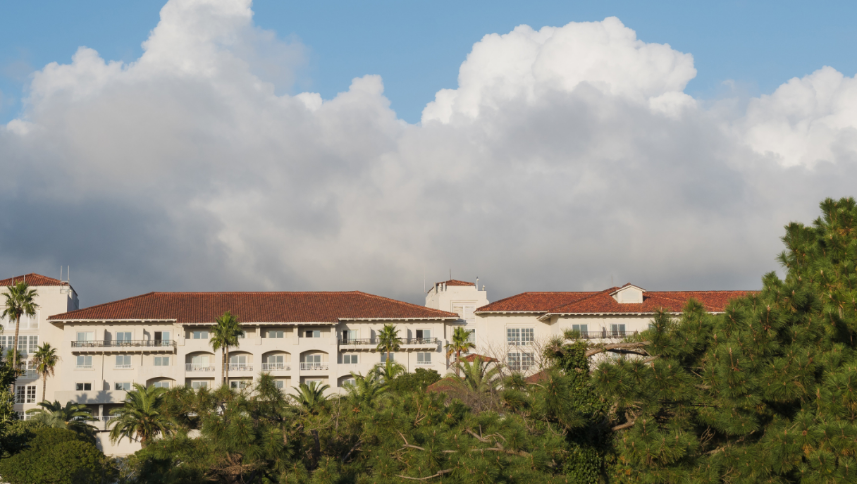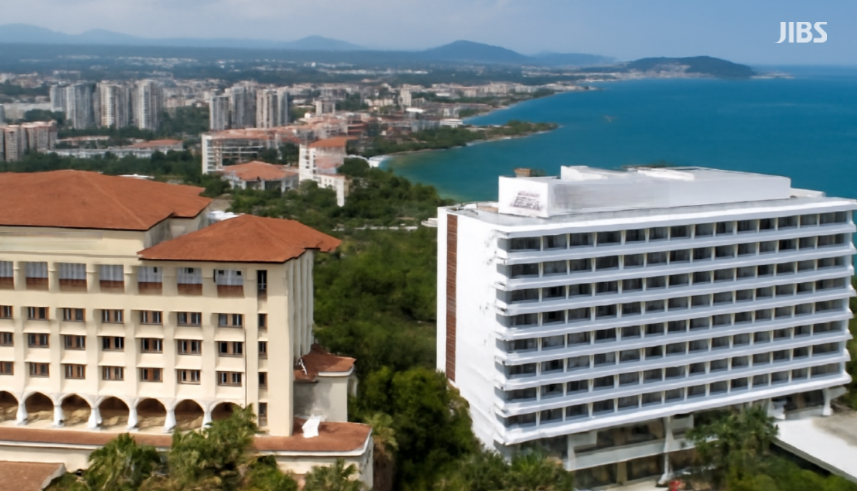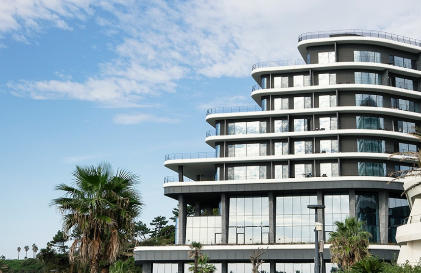 제주 호텔과 주변 경관. 외국인 관광객 수의 증가와 고급 숙박 수요의 상승을 시각적으로 반영한 편집 이미.