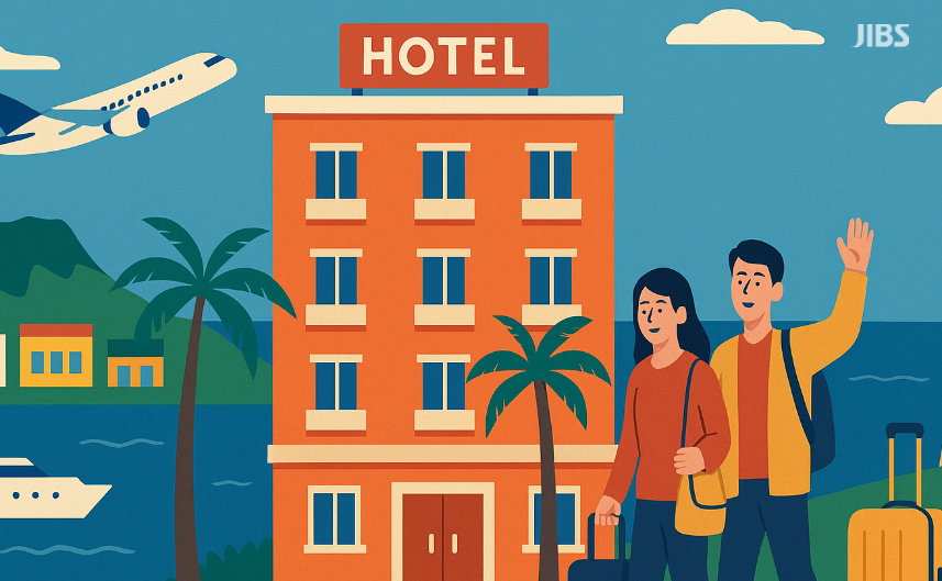 제주 호텔을 배경으로 한 관광객 모습. 관광지의 활기와 여행 소비층의 증가를 상징적으로 표현한 이미지.