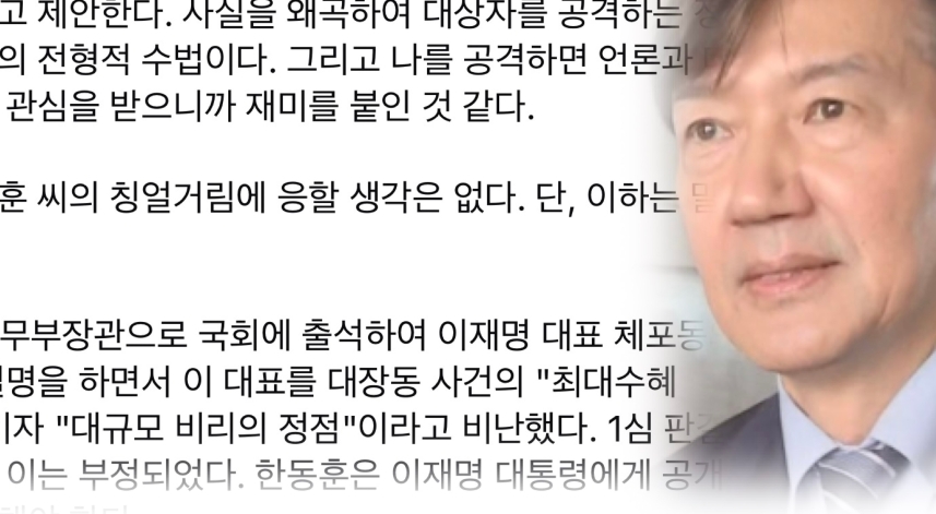 “논쟁을 피하지 말고, 대장동 항소 포기 사태에 대한 당신의 해석을 직접 말하라”면서 한 전 대표는 조 전 위원장의 명확한 입장 표명을 요구했습니다.