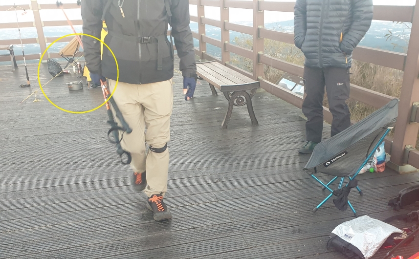 제주시 애월읍 큰노꼬메오름 정상 전망대를 점령한 텐트들. 취사에 사용한 것으로 보이는 부탄가스(황색 동그라미)가 보인다 (사진, 제주도청 홈페이지)