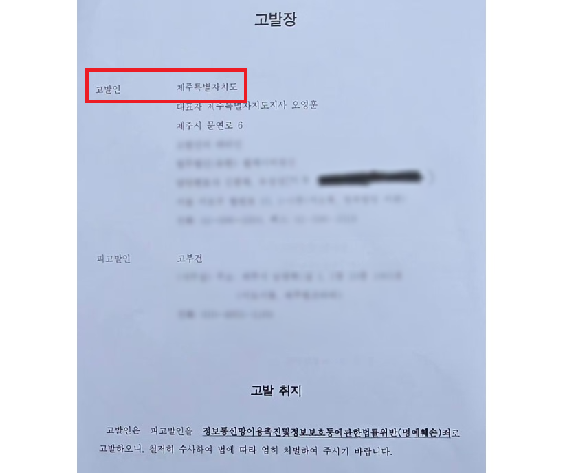 제주도가 고부건 변호사를 상대로 낸 명예훼손 혐의 고발장. 고발인에 법인격을 가진 '제주특별자치도'로 돼 있다.