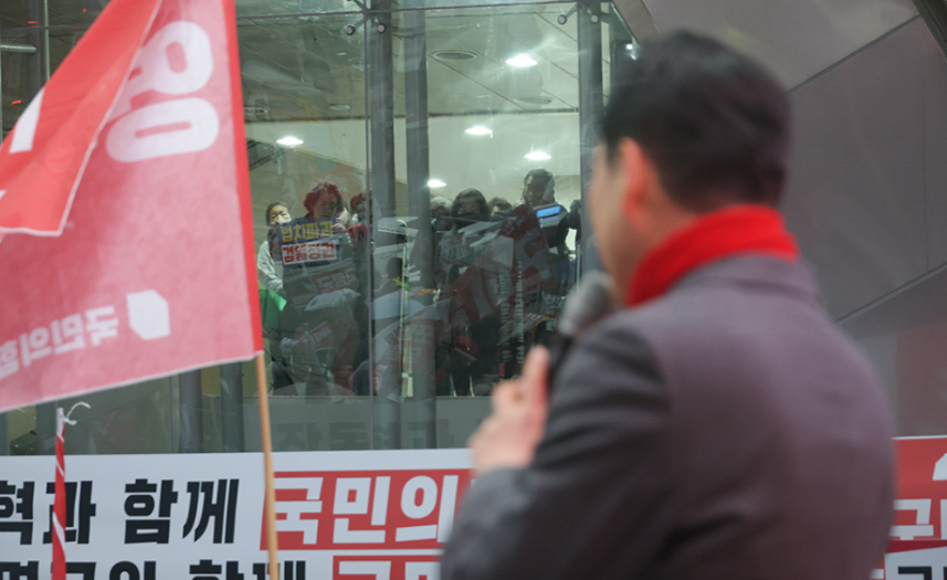 장동혁 대표가 발언하는 동안 유리벽 너머로 참가자들이 집회를 지켜보고 있다. (국민의힘)