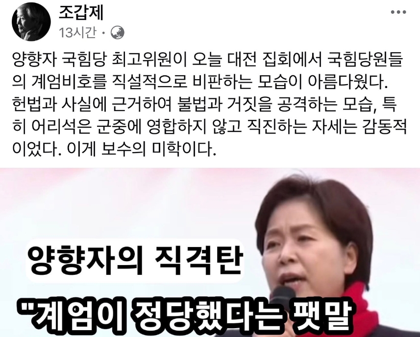 보수 논객 조갑제 조갑제닷컴 대표는 양향자 최고위원의 발언을 두고 “헌법과 사실에 기반한 정치였다”라며 “이게 보수의 미학”이라고 평가했습니다.