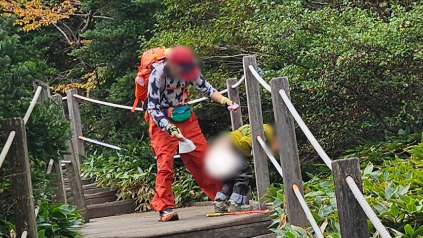 한라산 탐방로에서 바지를 내린 뒤 용변을 보는 아이와 휴지를 들고 기다리는 보호자