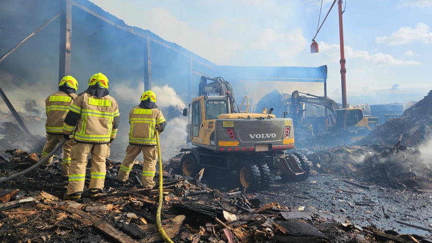 서귀포시 토평공업단지의 한 폐목재 가공 업체 야적장에서 화재가 발생한 지 20시간 만에 큰 불길이 잡힌 모습 (제주소방안전본부 제공)