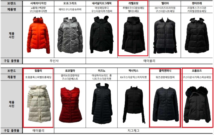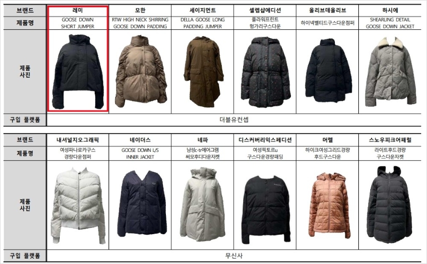 유통 플랫폼별로는 에이블리 2건, 지그재그 2건, 더블유컨셉 1건에서 부적합 제품이 확인됐습니다. 반면 무신사 유통 제품은 모두 거위털 함량 80% 이상으로 기준을 충족한 것으로 나타났습니다.