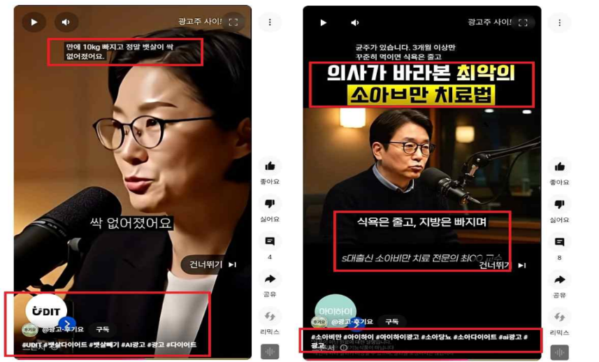 실존 인물처럼 보이는 가짜 전문가가 등장해 제품을 추천하고, 존재하지 않는 치료 효과를 의약품인양 선전합니다.