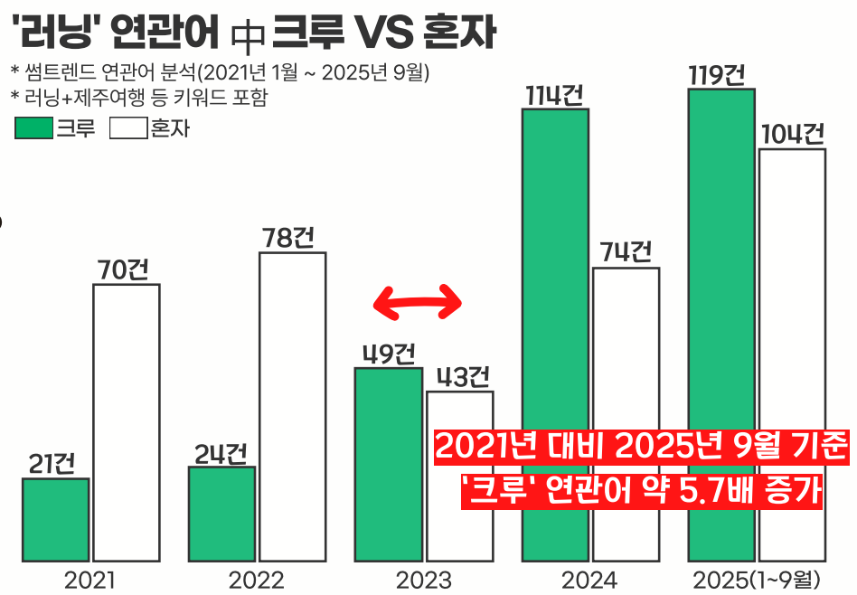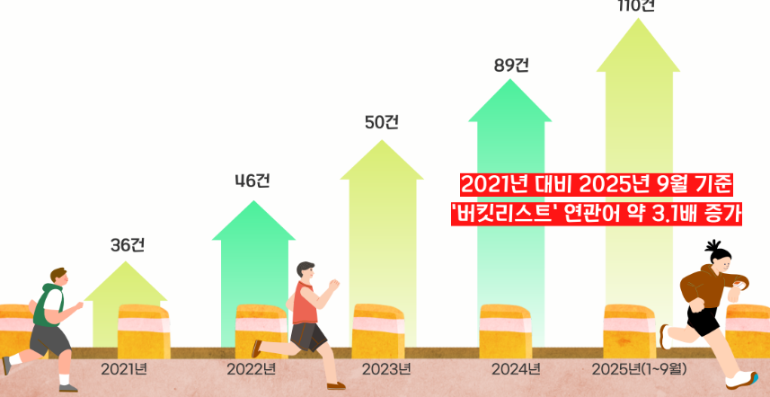 러닝과 제주 여행을 함께 언급한 게시글 가운데 ‘버킷리스트’ 언급은 2021년 36건에서 2025년 110건으로 세 배 이상 늘었습니다.