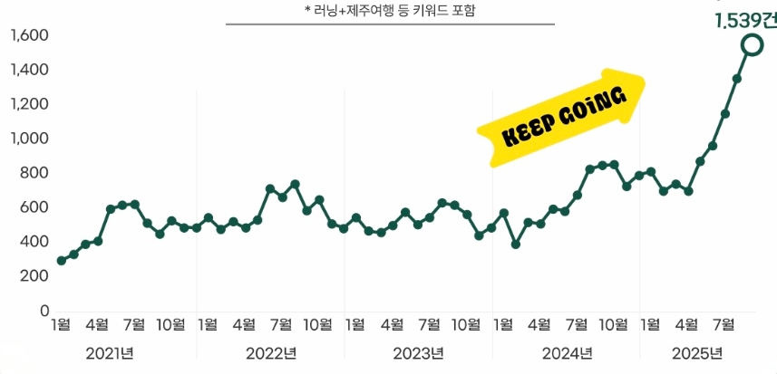 공사 분석 결과 ‘제주 여행+러닝’ 언급량은 2021년 약 5,700건에서 2025년 9월 기준 약 8,800건으로 늘었습니다. 5년 새 54% 증가한 수치입니다.