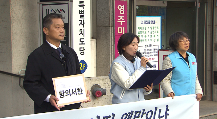 오늘(11일) 진보당 제주도당 민주당 도당 앞에서 가진 항의서한 전달 기자회견 (촬영, 박주혁 기자)