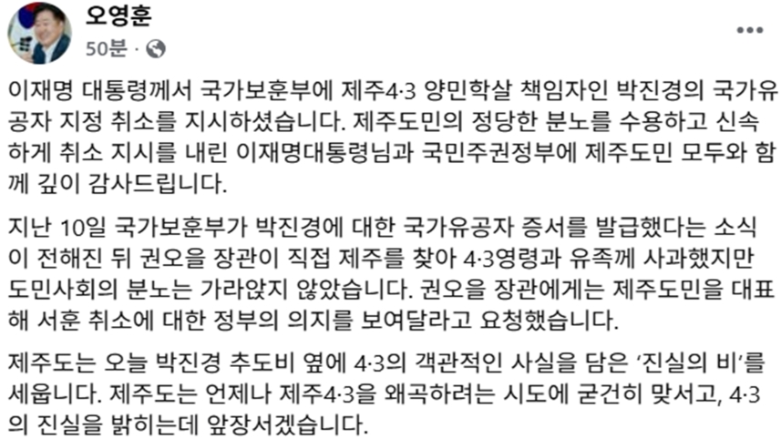 이재명 대통령이 4·3 당시 학살을 주도한 박진경 대령에 대한 국가유공자 지정 취소 검토를 지시한 것에 대해 오영훈 제주도지사가 "서훈 취소에 대한 정부의 의지를 보여달라"고 요청했습니다.