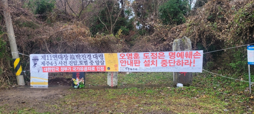 어제(14일) 박진경 대령 추도비 앞에 내걸린 안내판 설치 반대 현수막, 현재는 철거됐다.