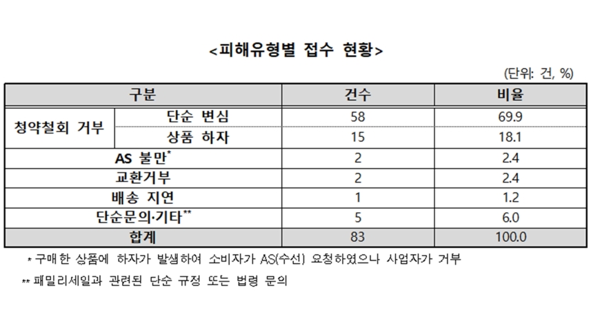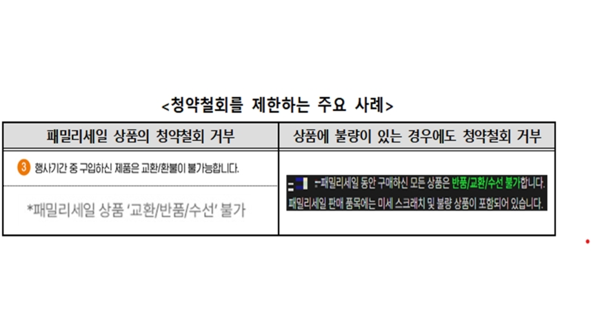 소비자원 관계자는 "패밀리세일은 이월 상품이나 재고상품을 주로 판매하는 만큼 소비자가 불량상품을 구매할 가능성도 있다"며 "상품 하자 시에도 청약철회를 제한하는 규정은 소비자의 권익을 침해할 우려가 있어 개선이 필요하다"고 밝혔습니다.